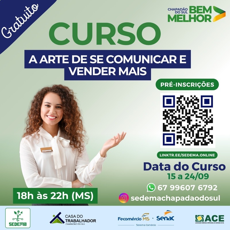 A Prefeitura de Chapadão do Sul, por meio da Secretaria de Desenvolvimento Econômico e Meio Ambiente (SEDEMA), em parceria com o SENAC – MS e a ACE – Associação Comercial Empresarial, abre inscrições para o curso “A Arte de se Comunicar e de Vender Mais”, que será realizado entre os dias 15 a 24 de setembro, das 18h às 22h (horário de MS).