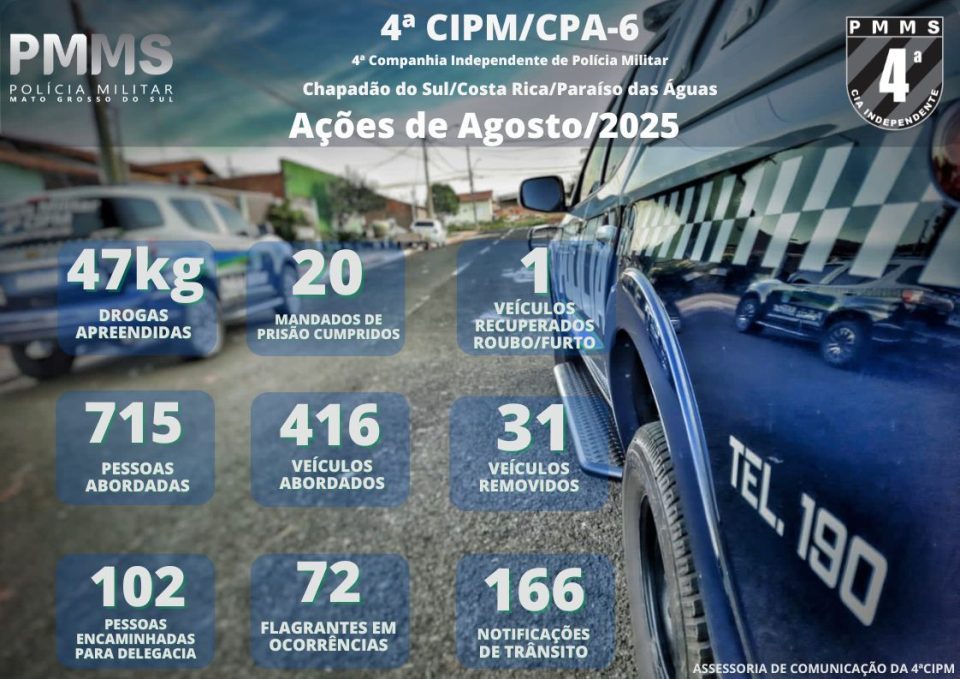 A 4ª Companhia Independente de Polícia Militar, que atua nos municípios de Chapadão do Sul, Costa Rica e Paraíso das Águas, encerrou o mês de agosto com resultados marcantes no combate à criminalidade, reafirmando seu papel fundamental na preservação da ordem pública e no enfrentamento da violência.