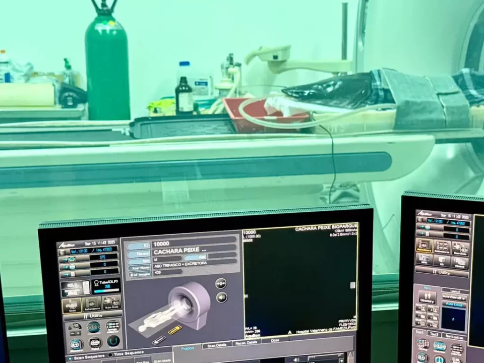 Cachara, que vive no Bioparque Pantanal, passou, nesta segunda-feira (15), por exames de ultrassonografia e tomografia inéditos em peixes da espécie. O procedimento foi realizado na UFMS (Universidade Federal de Mato Grosso do Sul), com acompanhamento de profissionais da área e acadêmicos.