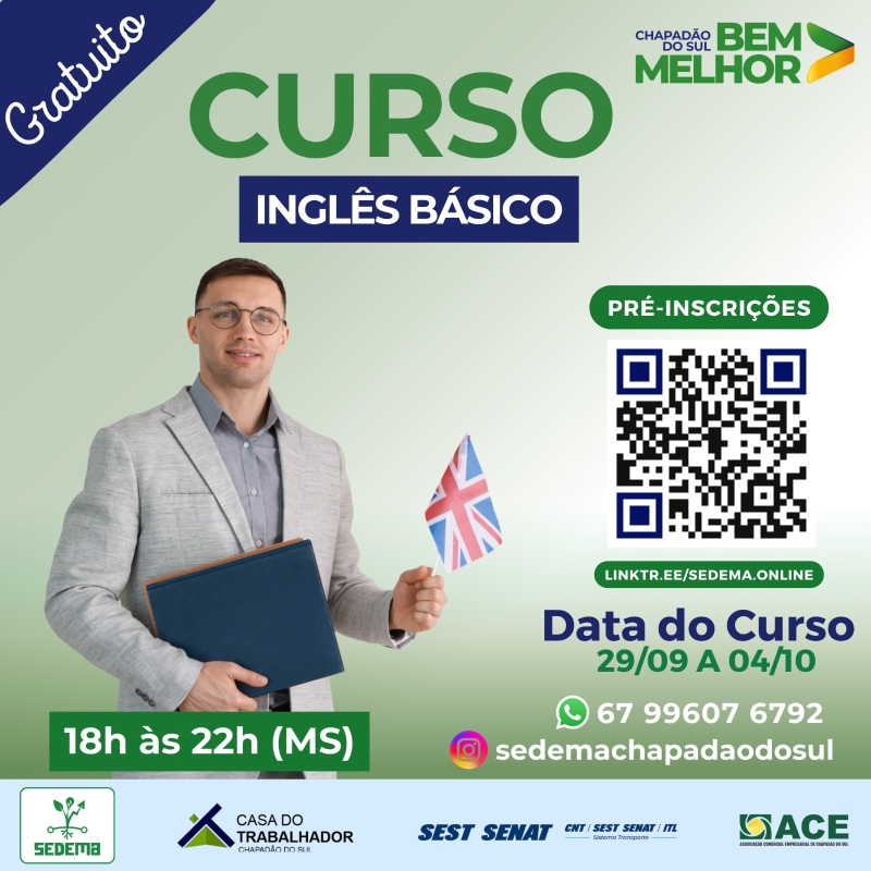 Com isso, a Prefeitura de Chapadão do Sul, por meio da Secretaria de Desenvolvimento Econômico e Meio Ambiente (SEDEMA), em parceria com o SEST SENAT e a ACE – Associação Comercial e Empresarial, abre inscrições para o curso gratuito de Inglês Básico, que acontecerá entre os dias 29 de setembro e 04 de outubro, das 18h às 22h (horário de MS).