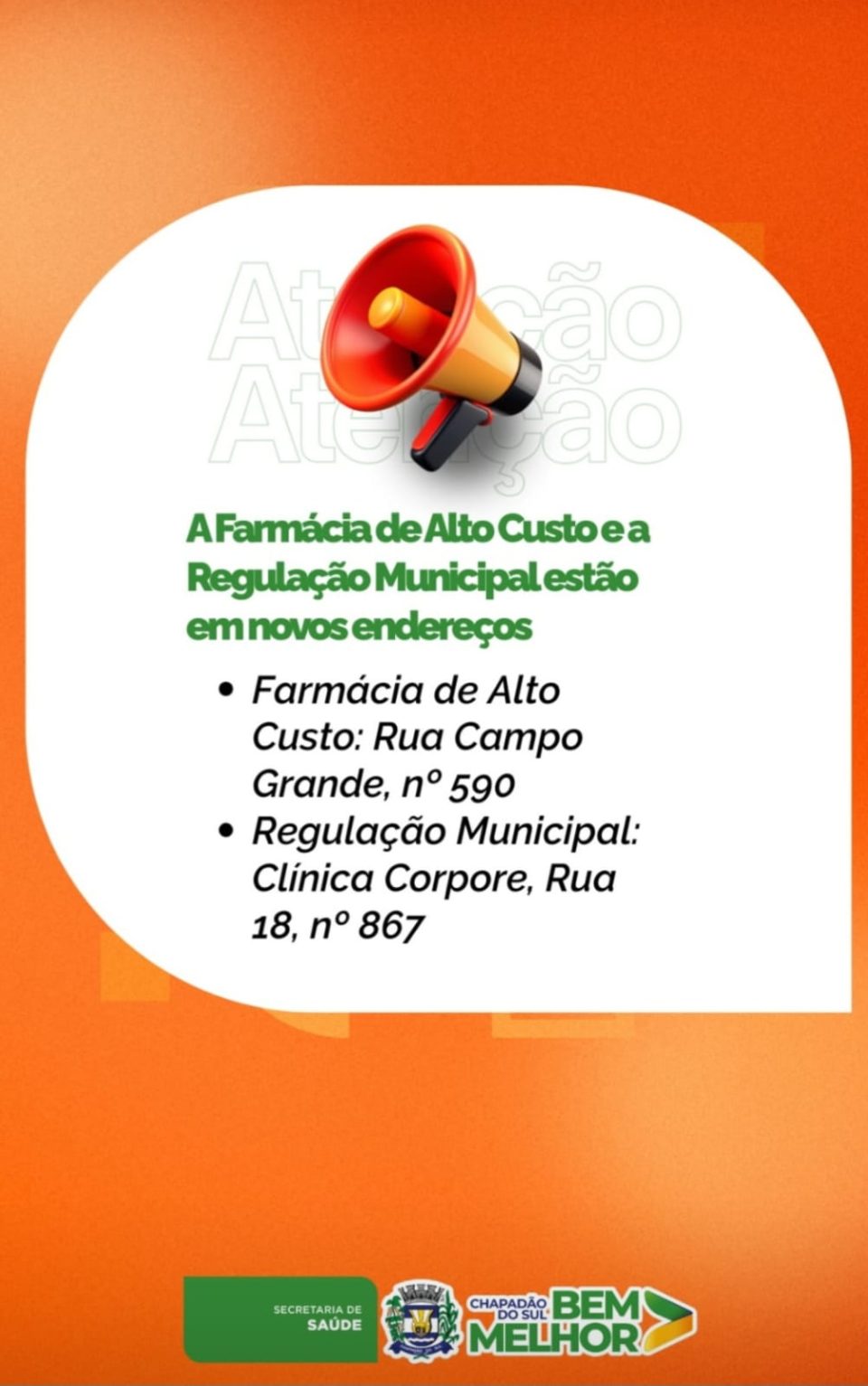 A Farmácia de Alto Custo e a Regulação Municipal de Chapadão do Sul estão atendendo em novos endereços para melhor comodidade da população. Fique atento às mudanças: