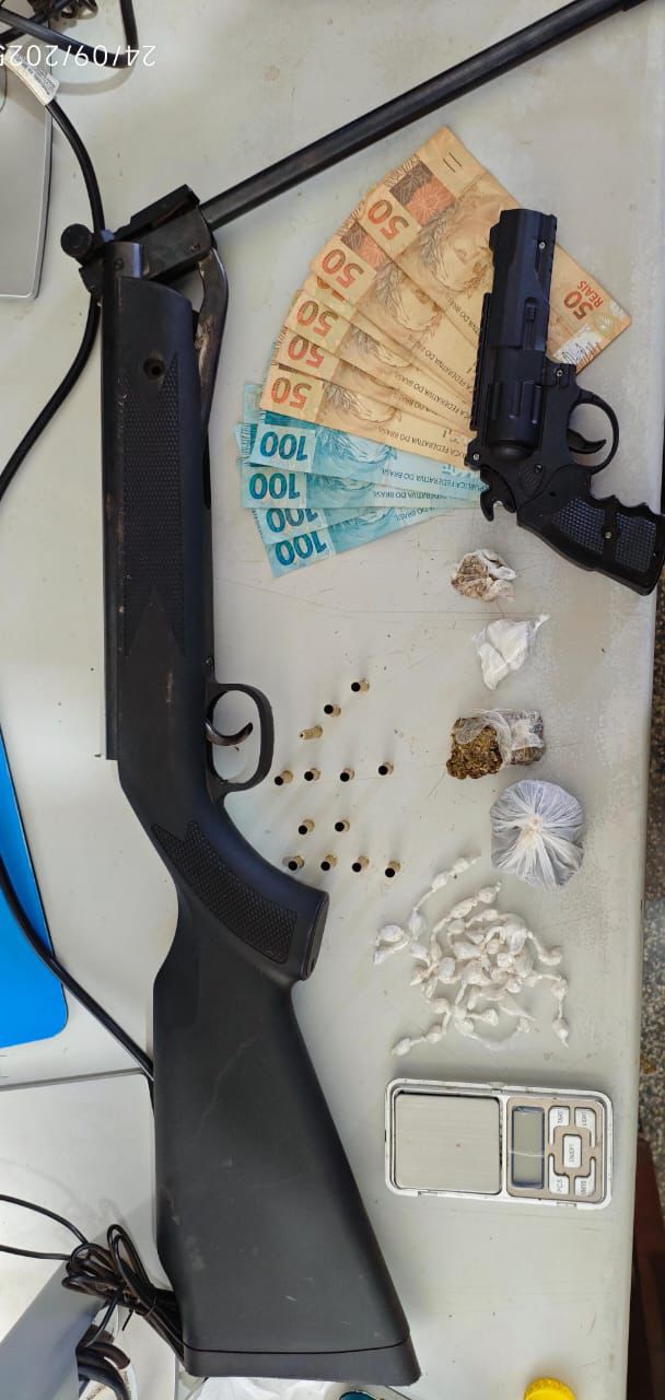 Na varredura do local, os policiais também apreenderam uma espingarda de pressão adaptada para calibre .22, 13 munições deflagradas e um simulacro de revólver.