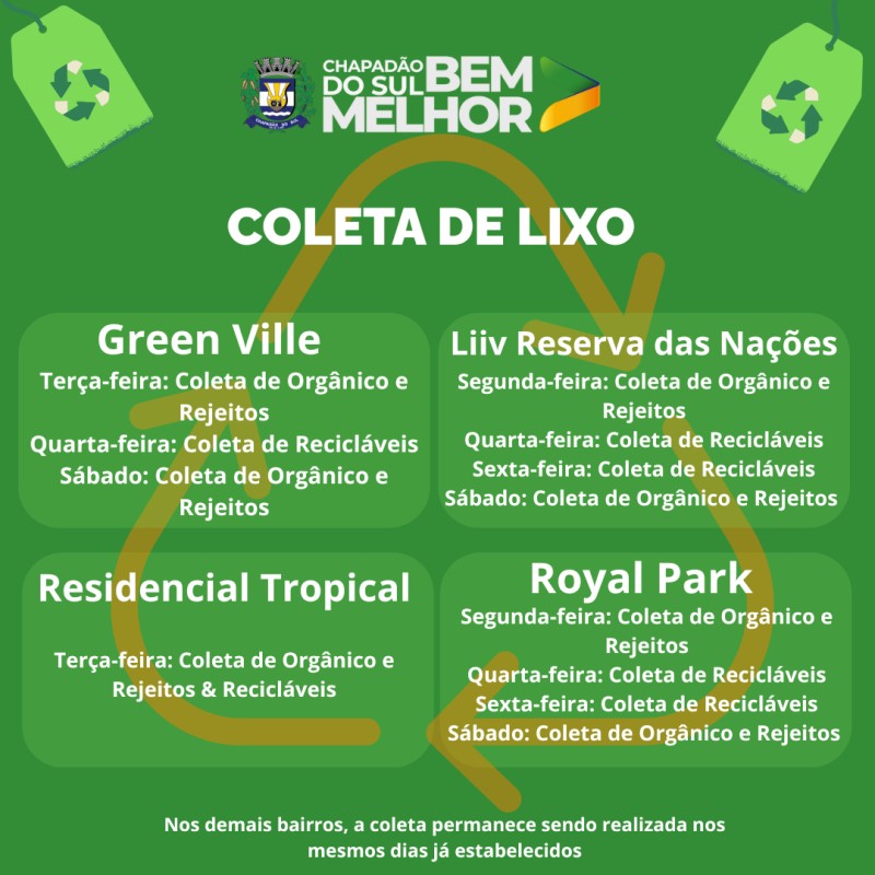 Nos demais bairros, a coleta seguirá normalmente de segunda a sábado, sendo às quartas e sextas-feiras destinada aos resíduos recicláveis e, nos demais dias, aos resíduos orgânicos e rejeitos.