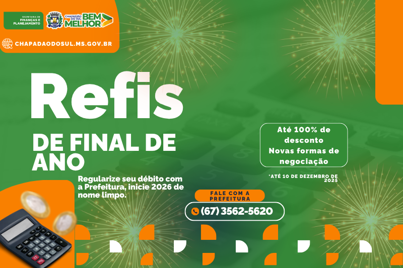 A Prefeitura de Chapadão do Sul lançou o refis de final de ano, programa criado para ajudar quem deseja encerrar o ano com nome limpo e a as contas em dia com o município. Essas condições fornecem formas de negociação jamais feitas antes em Chapadão do Sul.