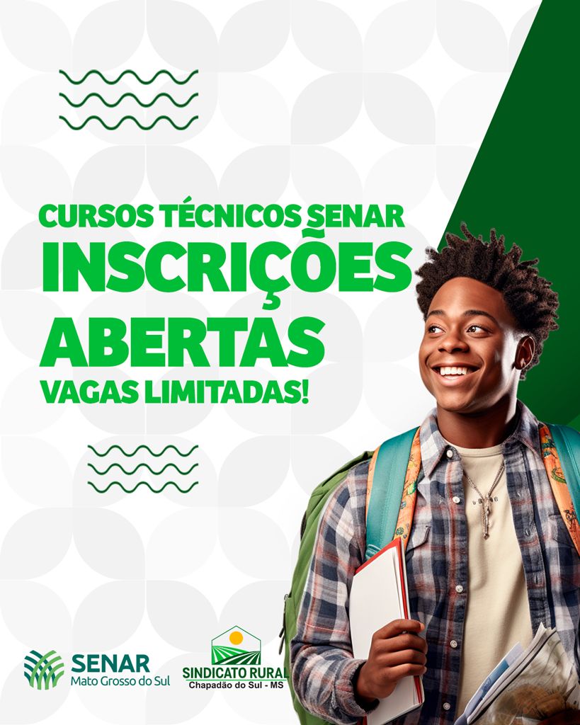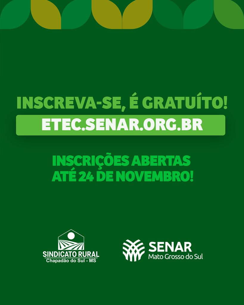 O Sindicato Rural de Chapadão do Sul, em parceria com o Serviço Nacional de Aprendizagem Rural (SENAR-MS), está com inscrições abertas para novos cursos técnicos gratuitos voltados à capacitação e ao desenvolvimento profissional no campo e na cidade.