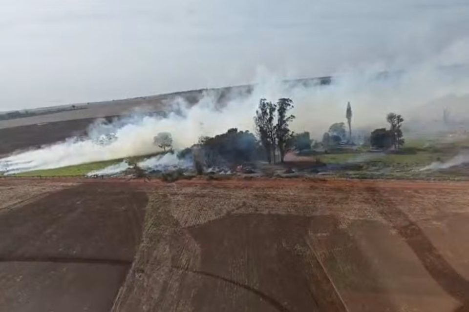 A Polícia Militar informou que os ocupantes expulsaram o caseiro e atearam fogo na sede da fazenda. As chamas se espalharam, formando densa fumaça sobre a área.