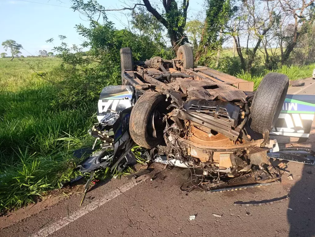 Imagens que chegaram ao Campo Grande News mostram muitos destroços, inclusive com buracos no trecho, e a viatura com o teto no asfalto, entre a pista e a vegetação.