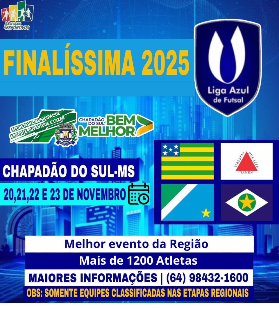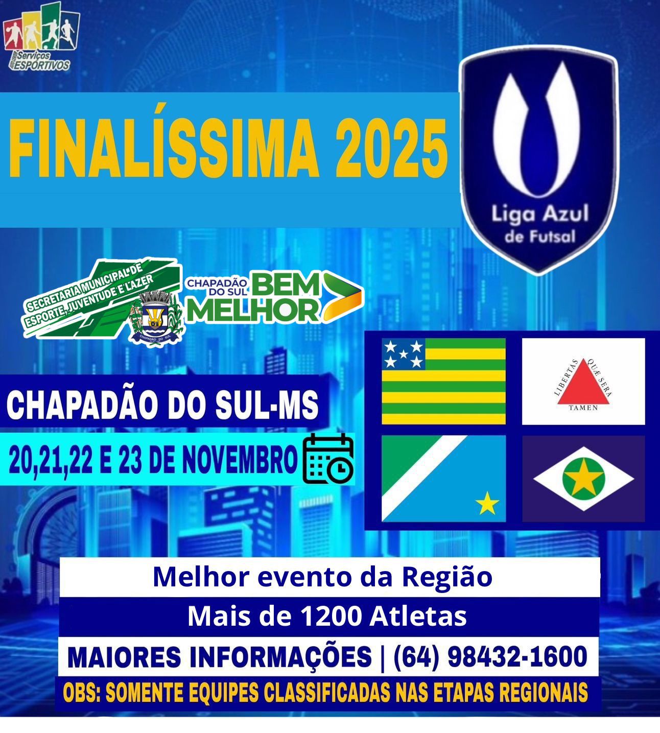 A espera acabou! Vem aí a finalíssima da Liga Azul de Futsal 2025, um dos maiores eventos esportivos já realizados na região, reunindo mais de 1.200 atletas vindos de quatro estados diferentes. Durante quatro dias intensos, Chapadão do Sul será o palco central dessa grande celebração do futsal, que promete movimentar toda a cidade.